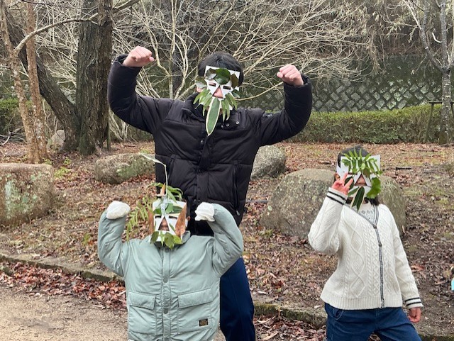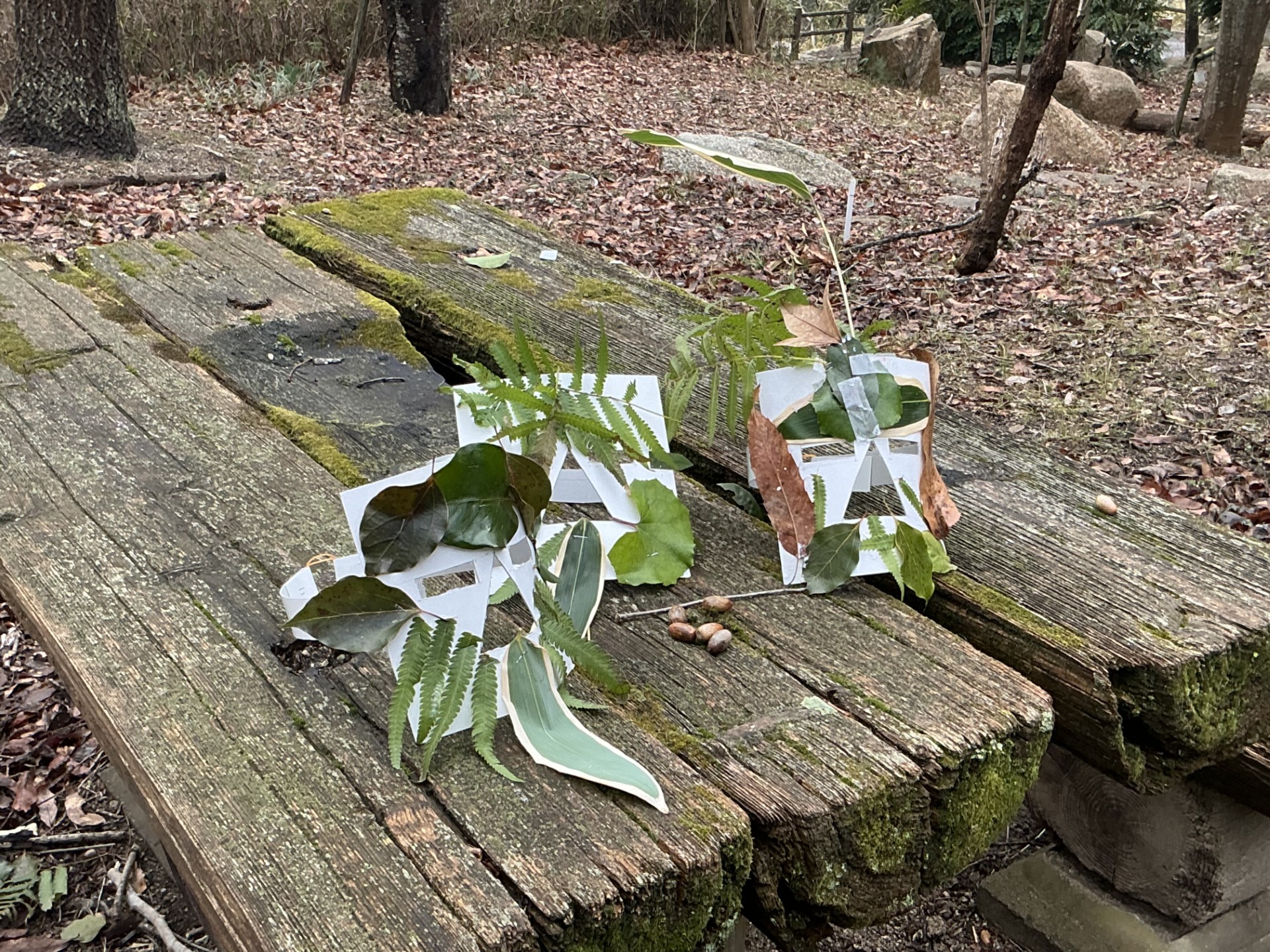 お面の土台に葉っぱをつけて、かぶってみると森の人になりました
