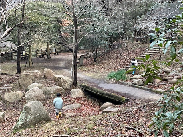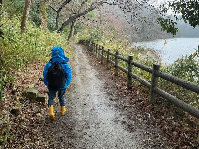 雨の中ゆっくり遊歩道を歩きながら生き物探し、雨も降ってて寒いし、なかなか見つからないなあ!
